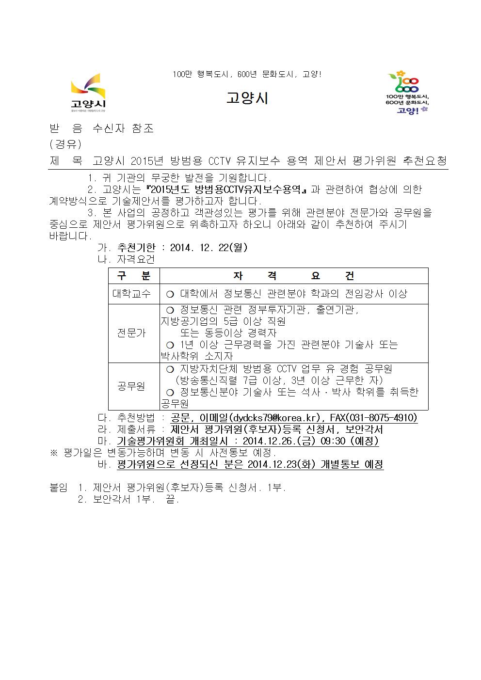[고양시] 2015년 방범용 CCTV 유지보수 용역 제안서 평가위원 추천