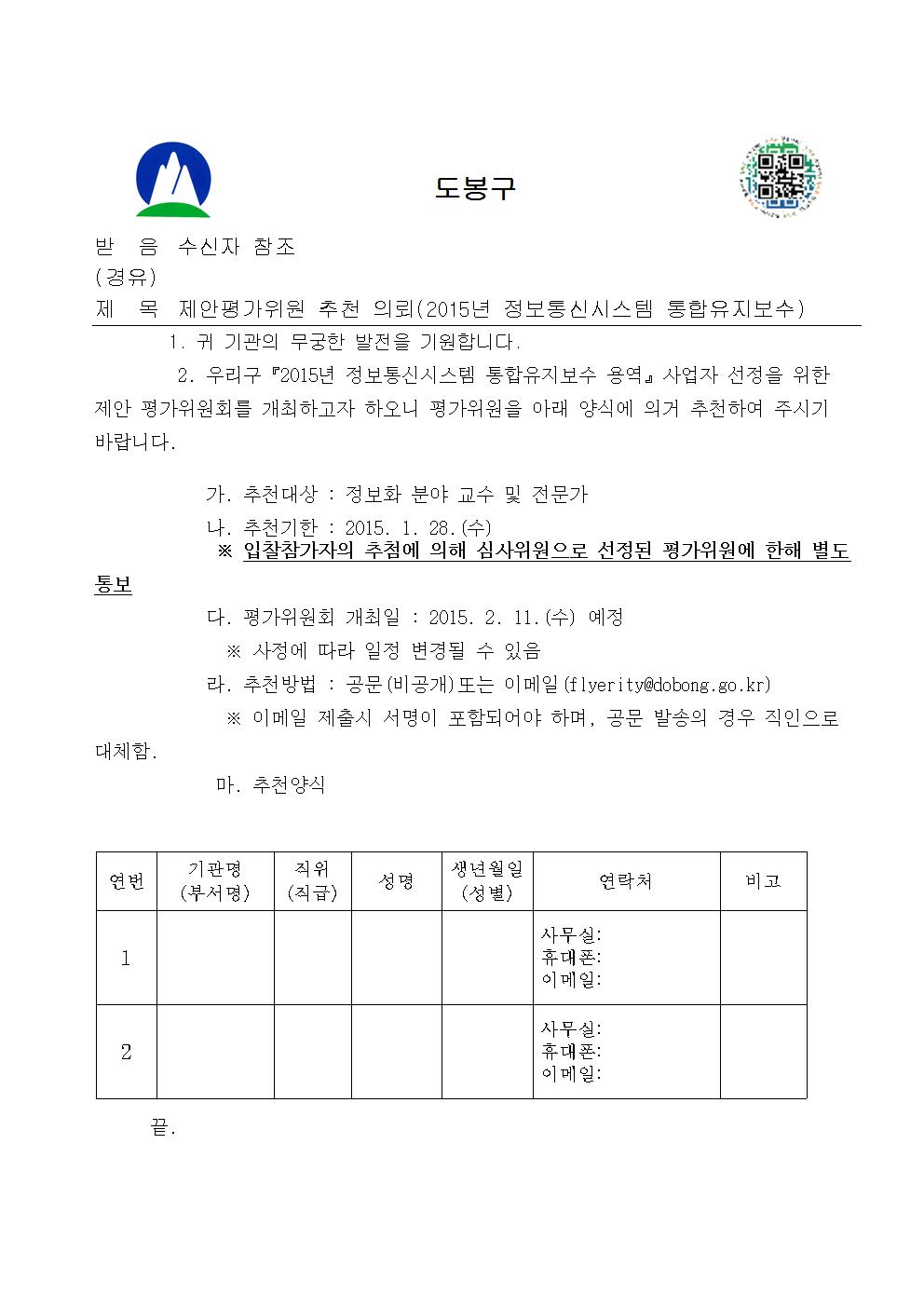 [도봉구] 제안평가위원 추천 의뢰(2015년 정보통신시스템 통합유지보수)