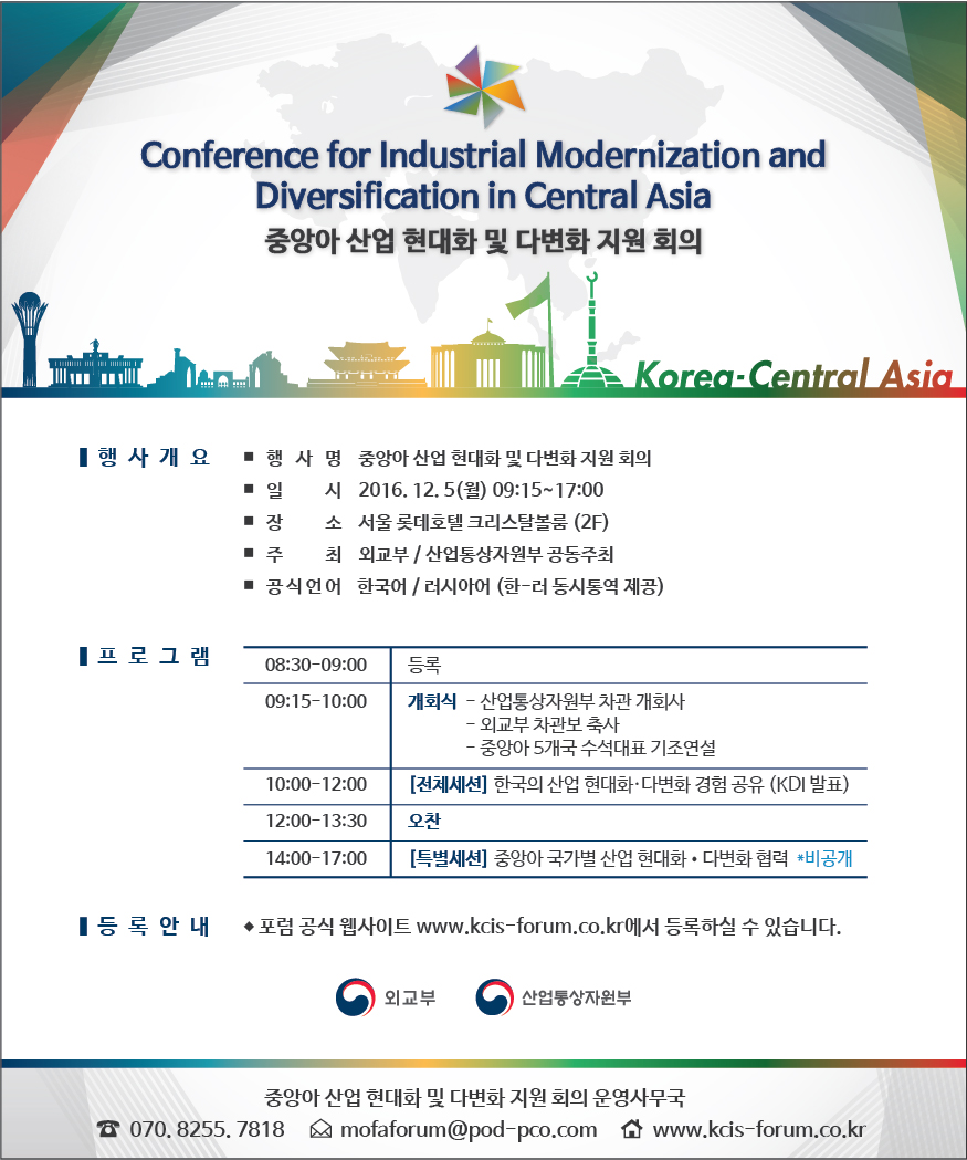 이에 한-중앙아 산업연계성 강화를 통한 중앙아 국가들의 신성장동력 창출에 기여하고자 아래와 같이 ‘중앙아 산업 현대화 및 다변화 지원회의’를 외교부와 산업통상자원부 공동으로 12.5(월), 서울 롯데호텔에서 개최할 예정입니다.