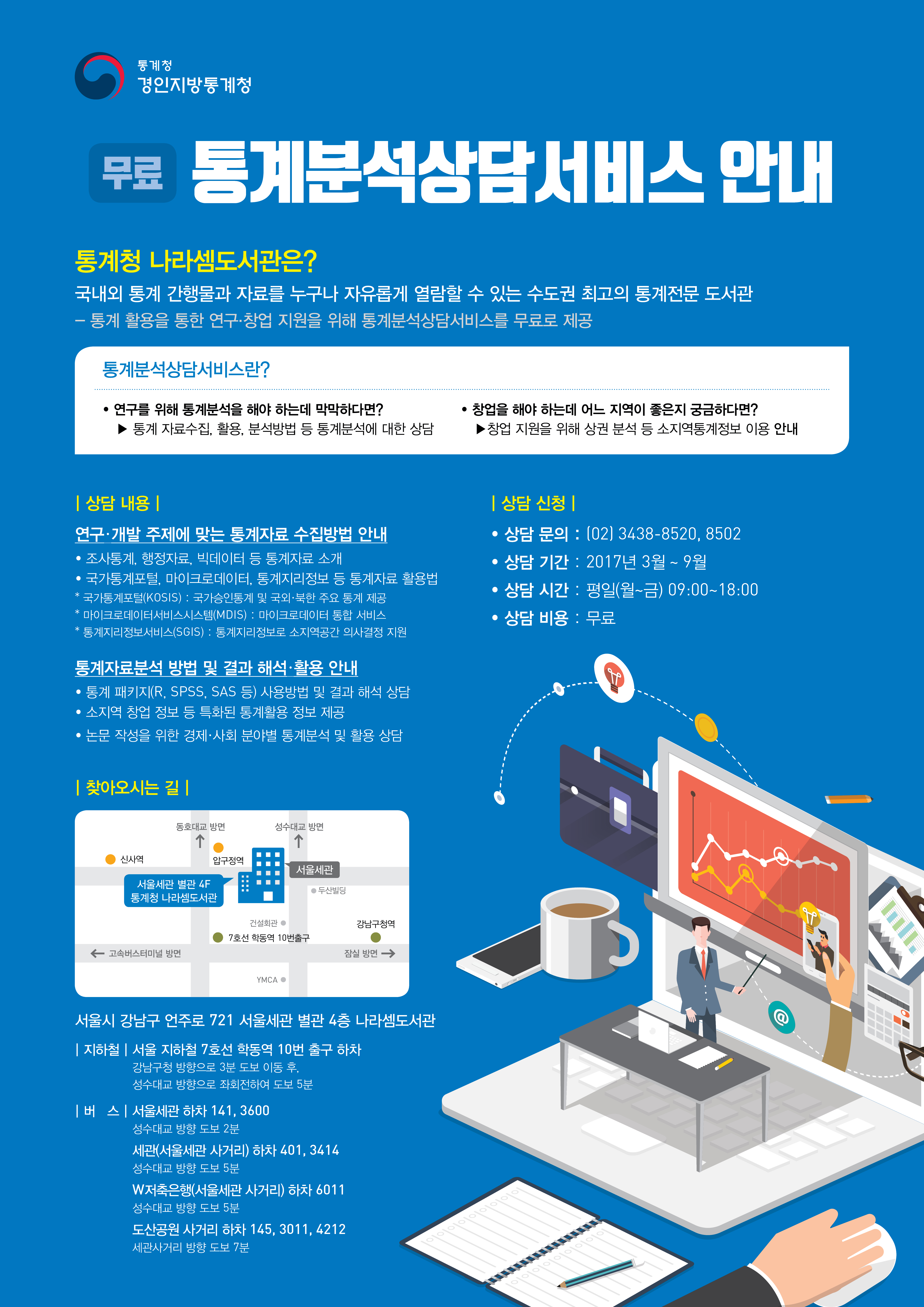 - 상담 기관 : 나라셈도서관 통계상담실(서울 강남구 언주로 721 서울세관 별관 4층)