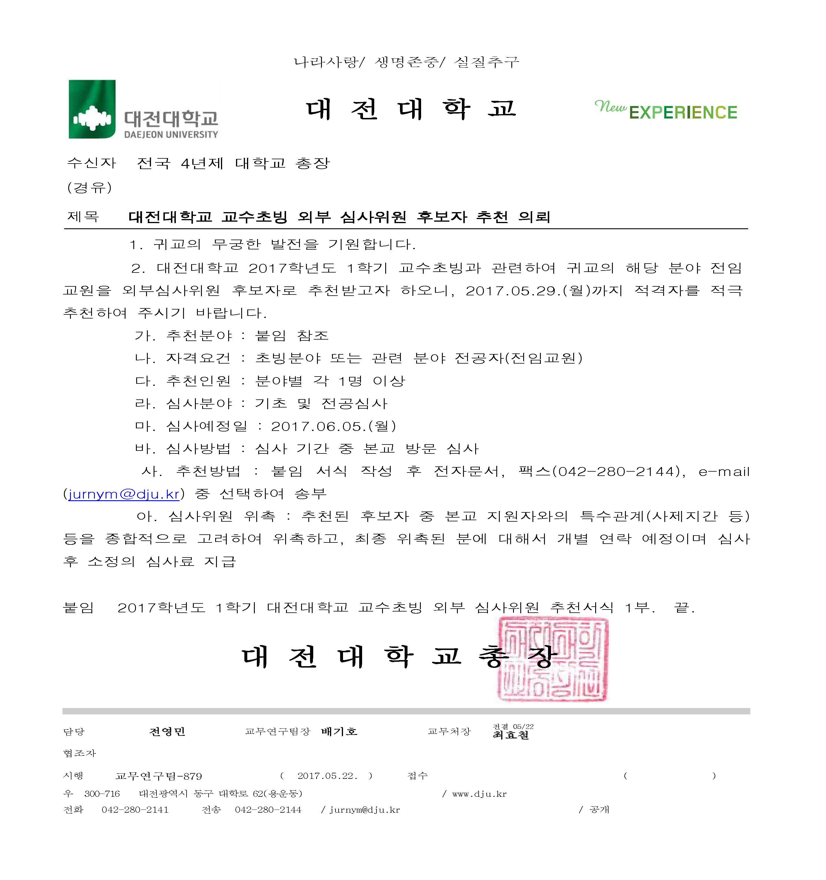 [대전대학교] 대전대학교 교수초빙 외부 심사위원 후보자 추천 의뢰