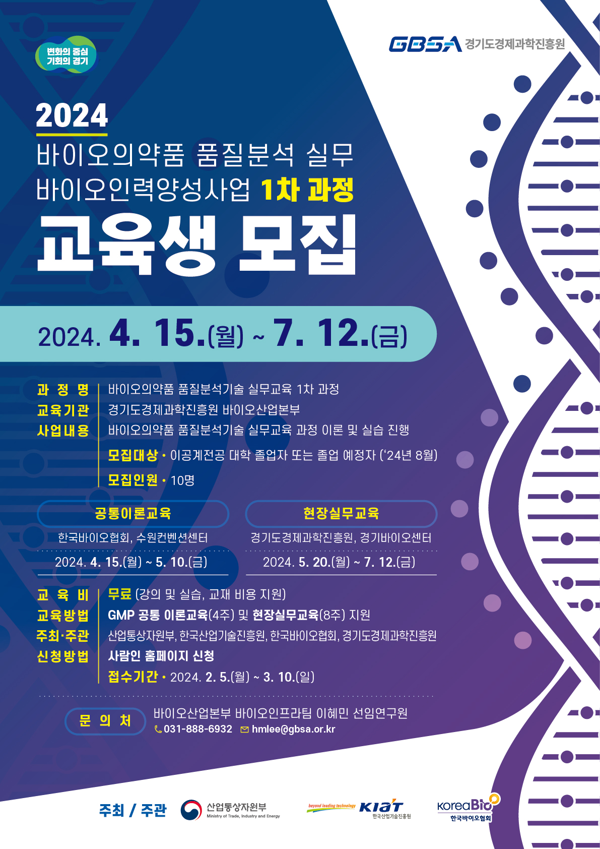 1. (재)경기도경제과학진흥원 바이오센터에서는 산업통상자원부가 지원하는 ‘바이오인력양성사업’의 교육기관으로 참여하여 바이오의약품 분야의 전문인력 양성을 위한 교육 및 관련 기업 취업 지원을 도모하고 있습니다.