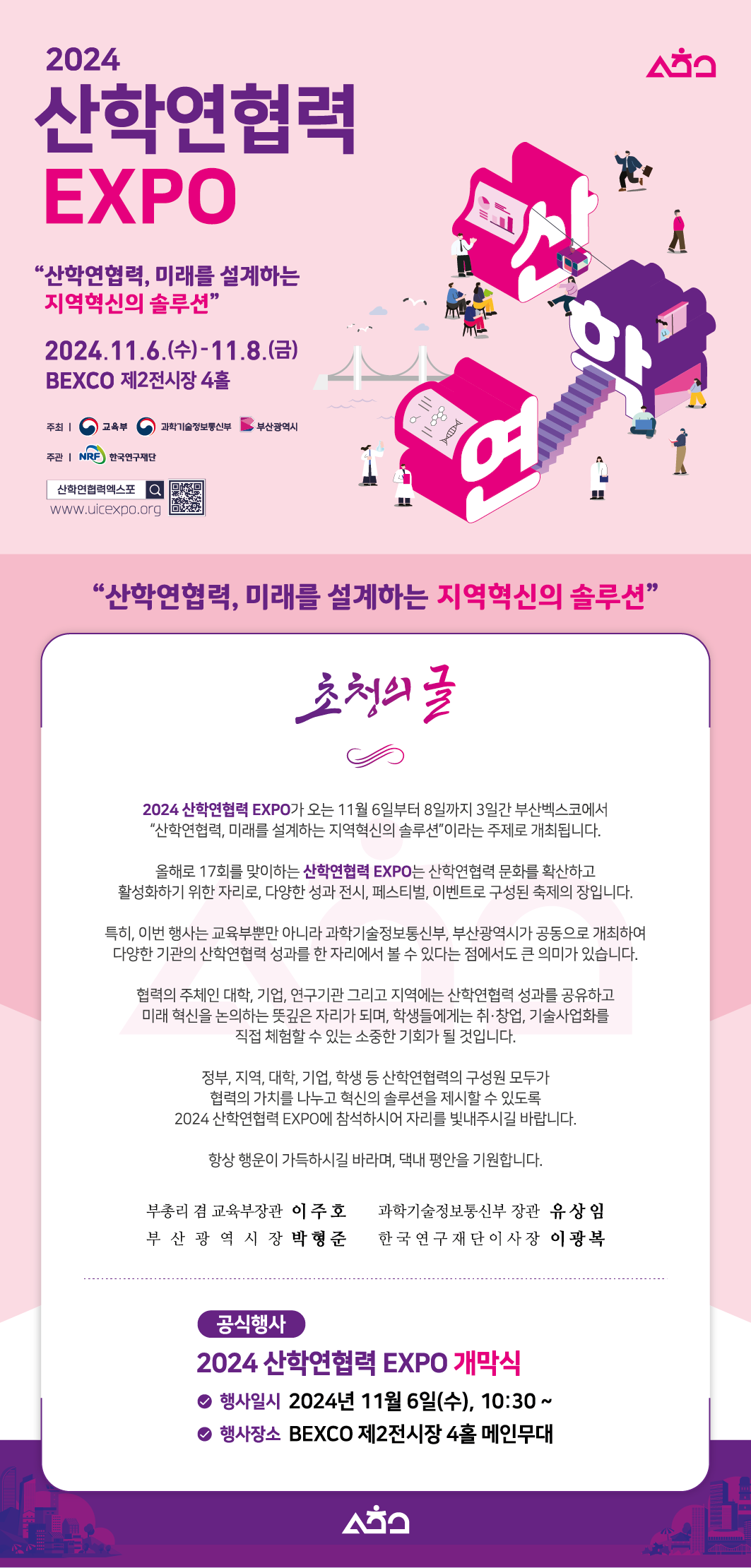 교육부·과학기술정보통신부·부산광역시가 공동 주최하고 한국연구재단이 주관하는 2024 산학연협력 EXPO가 “산학연협력, 미래를 설계하는 지역혁신의 솔루션”을 주제로 아래와 같이 개최되오니, 많은 관심과 참여 부탁드립니다.