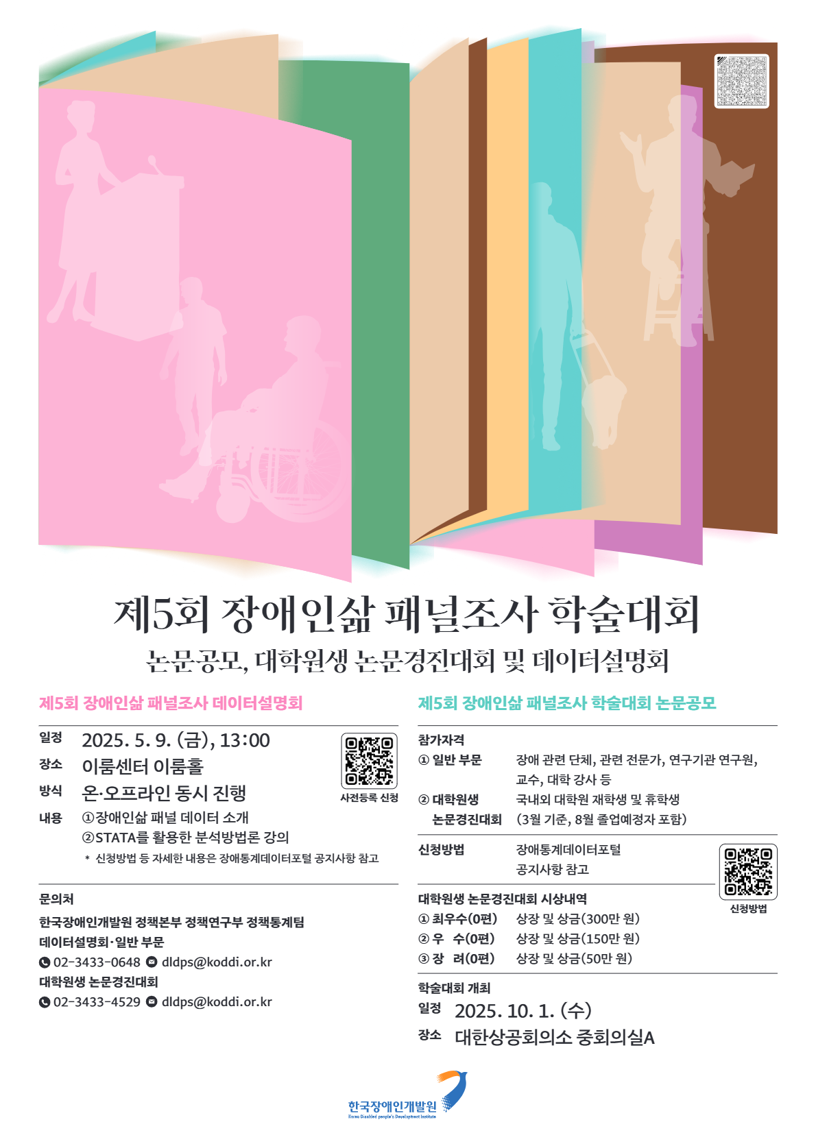 한국장애인개발원은 장애인삶 패널조사 데이터를 활용한 연구 활동을 활성화하고 장애인 정책 발전을 도모하고자「제5회 장애인삶 패널조사 학술대회」를 개최합니다.