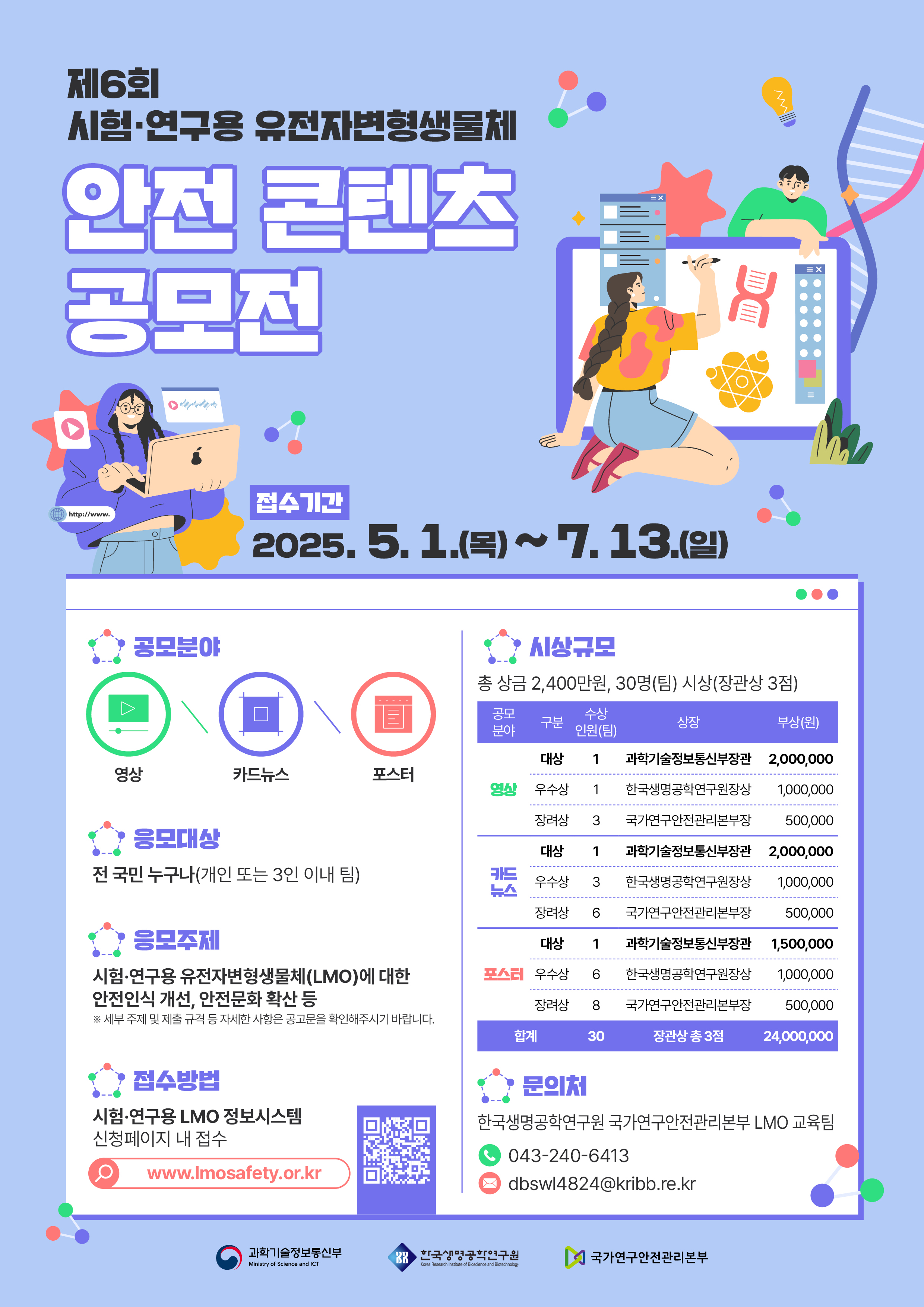 과학기술정보통신부에서는 시험·연구용 유전자변형생물체 안전문화 확산·정착을 위한 홍보 컨텐츠를 공모하기 위해 「제6회 시험·연구용 유전자변형생물체 안전 콘텐츠 공모전」을 아래와 같이 실시하오니 많은 참여 부탁드립니다.