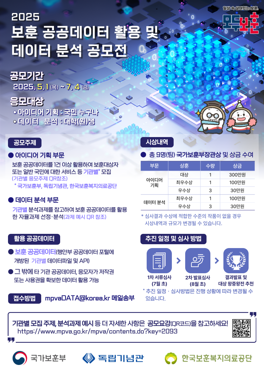 국가보훈부와 산하기관(독립기념관, 한국보훈복지의료공단)에서는 보훈 공공데이터를 활용하여 보훈대상자 및 국민들에게 더 나은 서비스를 제공할 수 있도록 국민 여러분의 창의적인 아이디어를 발굴하고자 「2025년 보훈 공공데이터 활용 및 데이터 분석 공모전」을 개최합니다.