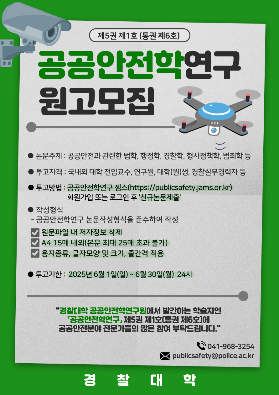 경찰대학 공공안전학연구원(원장 손재영 교수)에서 발간하는「공공안전학연구」제5권 제1호(통권 제6호)에 게재할 논문을 아래와 같이 모집하고 있으니 학교 홈페이지 및 포털 게시 등 홍보에 협조하여 주시기 바랍니다.