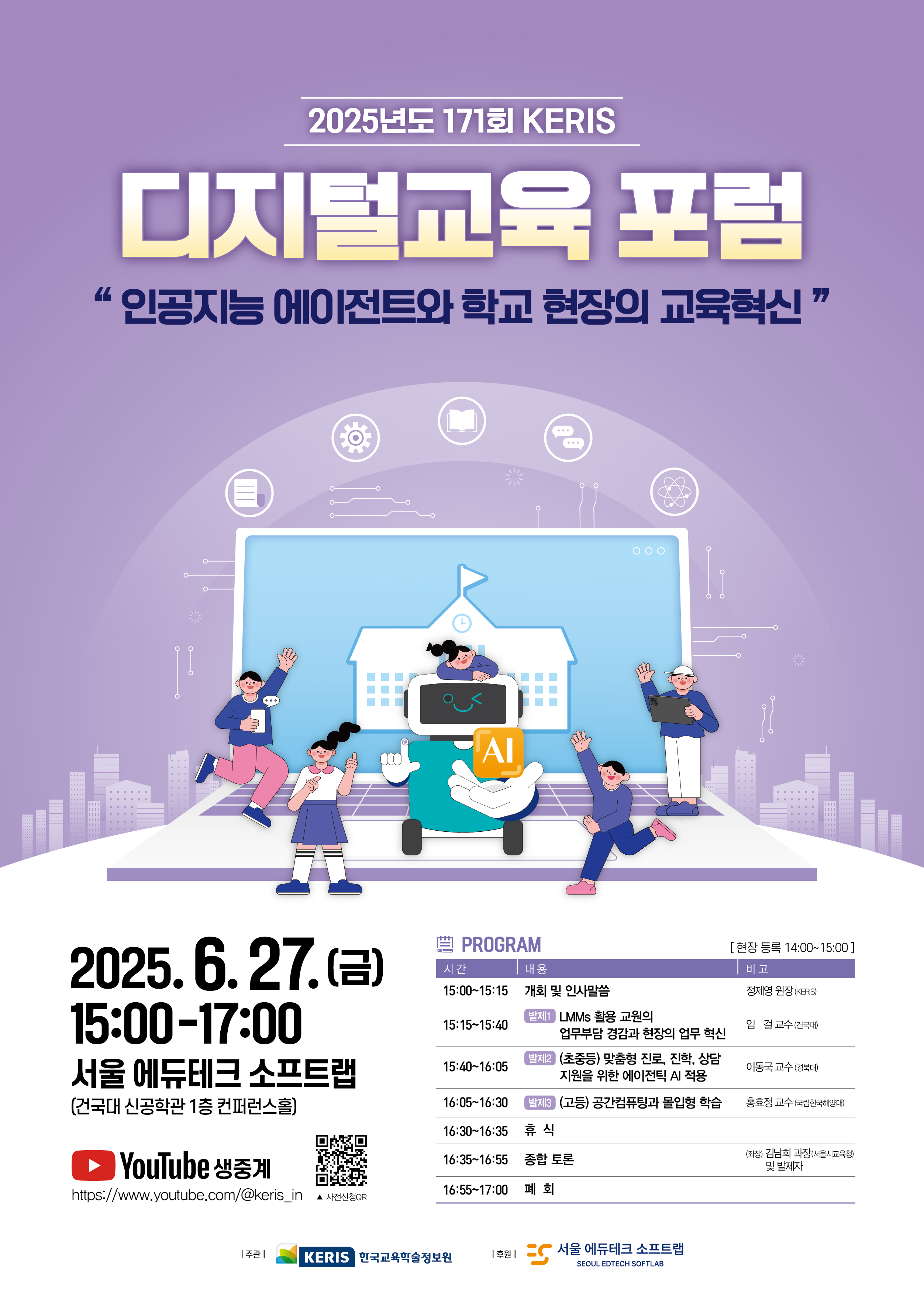한국교육학술정보원에서는 '인공지능 에이전트와 학교 현장의 교육혁신'을 주제로 『제171회 KERIS 디지털교육 포럼』을 개최합니다.