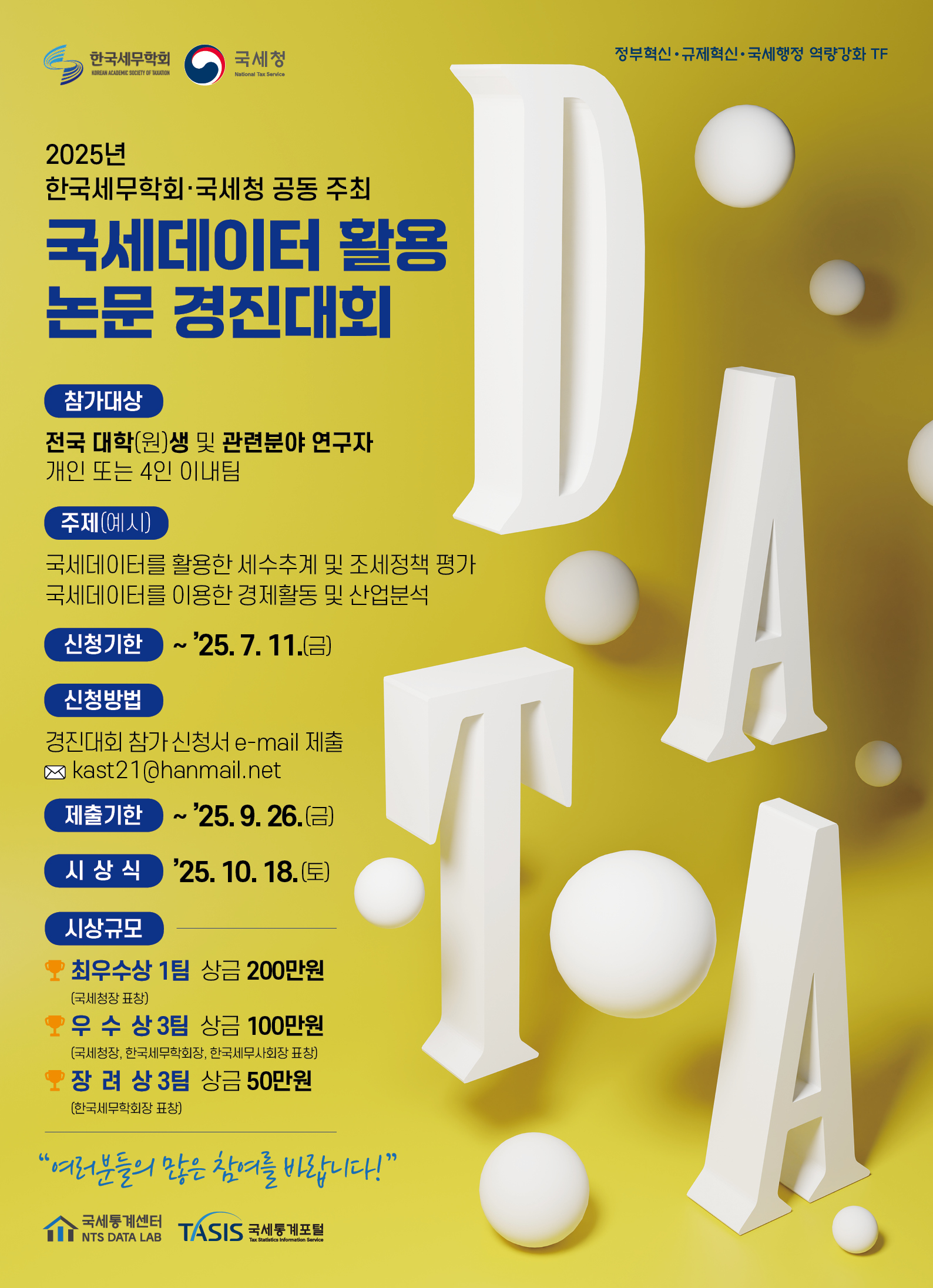 대학(원)생들이 국세데이터 활용 논문 경진대회에 참가할 수 있도록 적극 안내해 주시기 바랍니다.