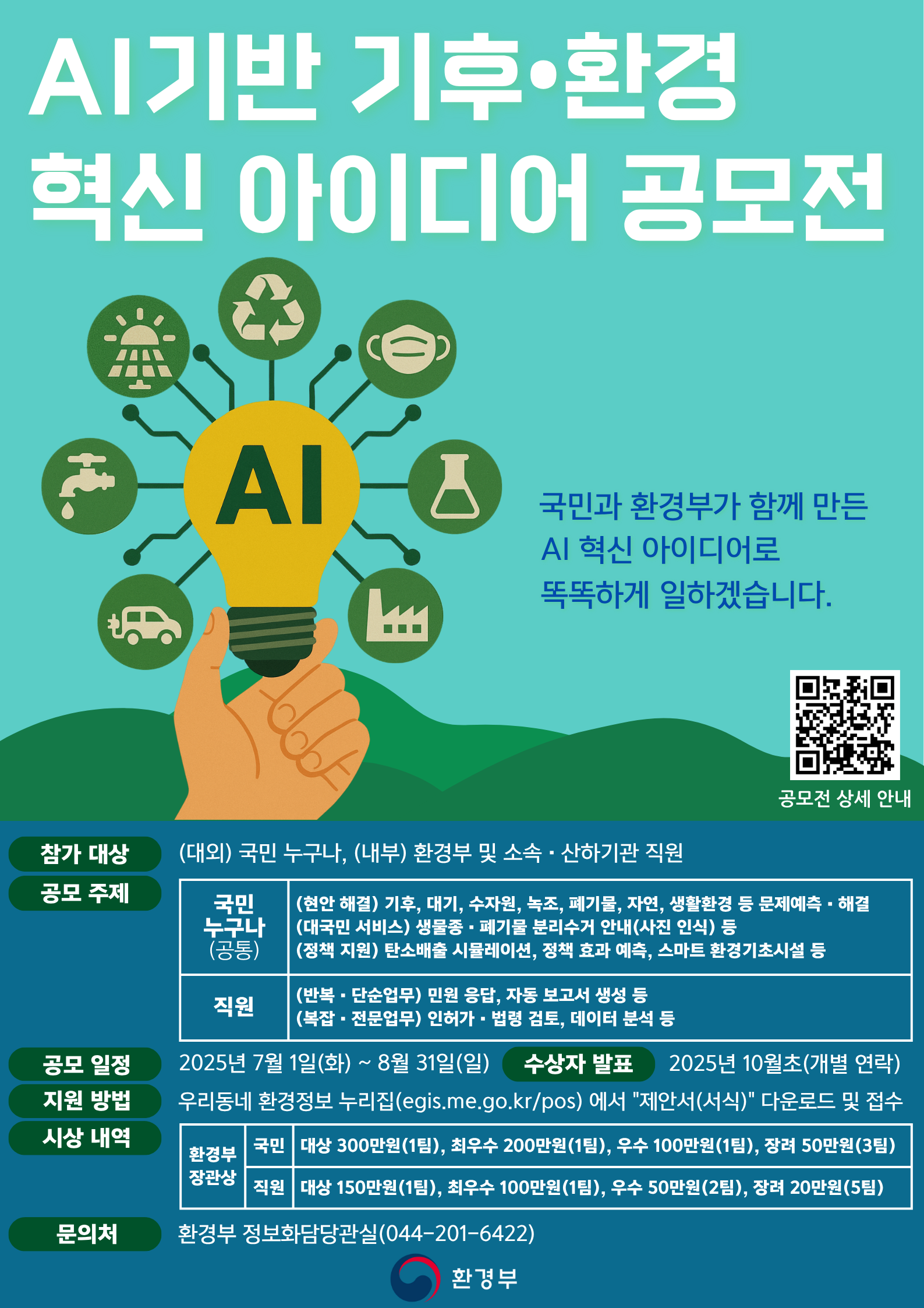 환경부에서는 급속하게 발전하고 있는 AI 기술을 기후·환경 현안 해결 및 행정 서비스에 활용하고자「AI 기반 기후·환경 혁신 아이디어 공모전」을 추진하오니 소속 직원·학생·회원 등을 비롯하여 많은 국민들이 참여할 수 있도록 기관 홈페이지에 포스터 게시 등 홍보에 적극 협조하여 주시기 바랍니다.