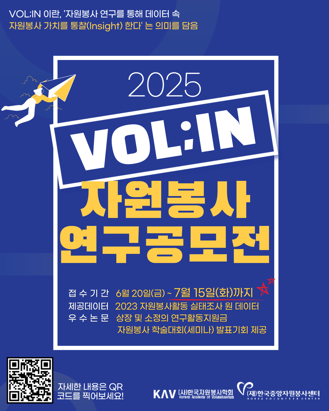 (재)한국중앙자원봉사센터와 (사)한국자원봉사학회는 자원봉사 분야의 전문 연구자를 발굴하고, 데이터 기반의 심층적·다각적 연구를 지원하여 자율적인 자원봉사 연구생태계를 조성하고자 「2025 자원봉사 연구공모전 VOL:IN」을 추진합니다.