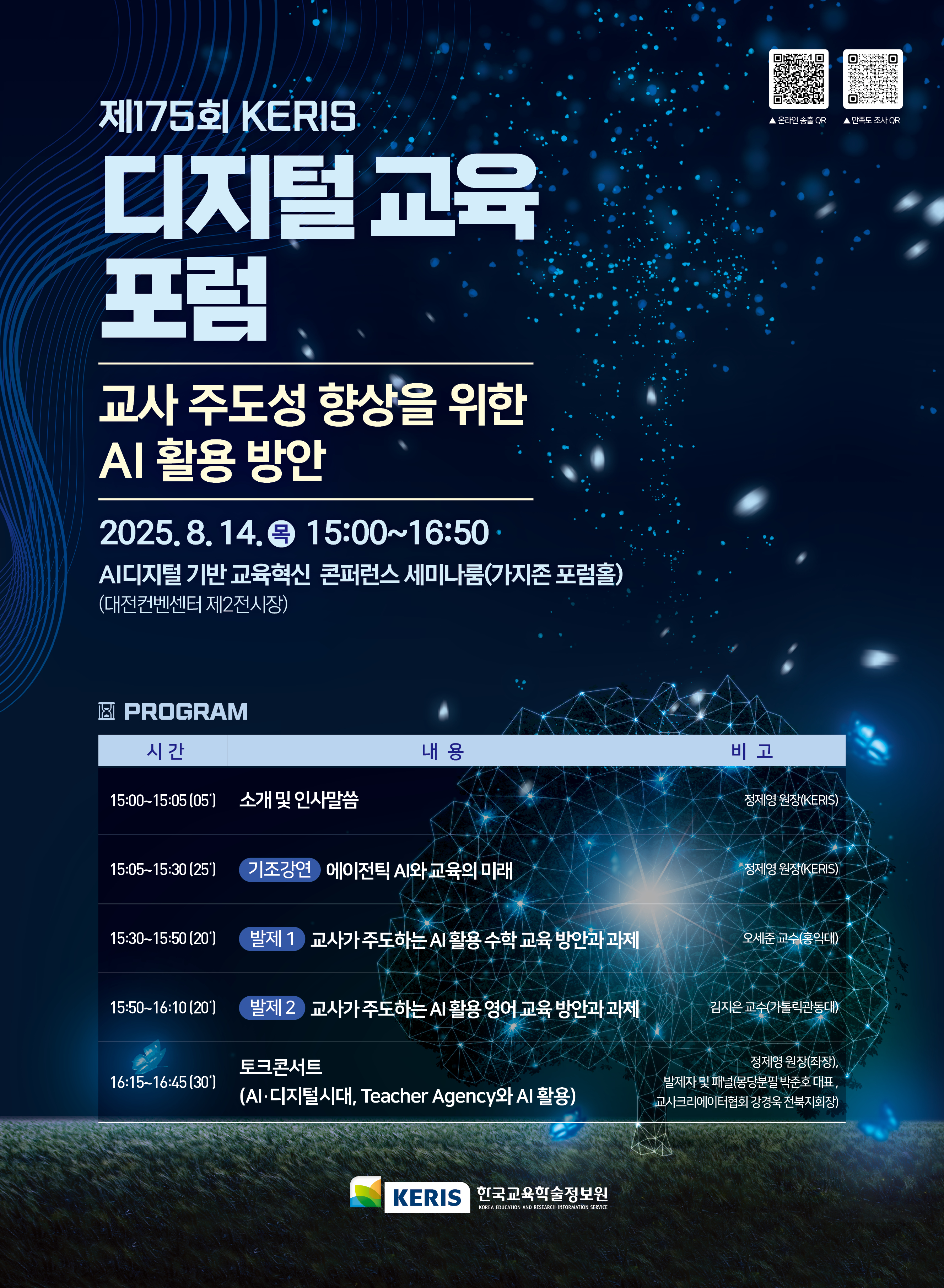 1. 한국교육학술정보원에서는 교육부와 17개 시도교육청이 주최하고, 한국교육학술정보원이 주관하는 2025 AI·디지털 기반 교육혁신 콘퍼런스와 연계 행사로『제175회 KERIS 디지털교육 포럼』을 개최합니다.