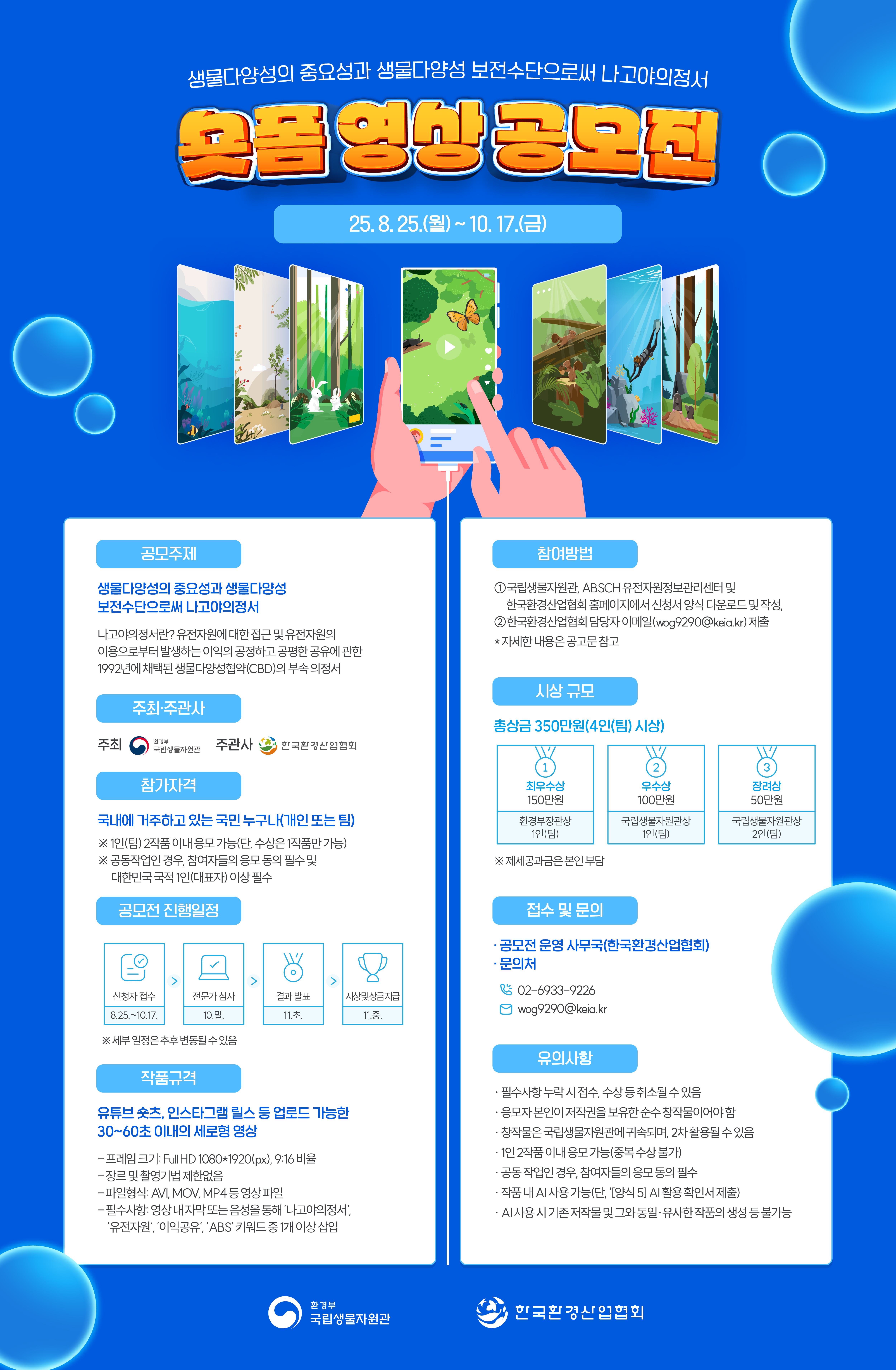 1. 우리 협회는 생물다양성의 중요성과 나고야의정서 저변 확대를 위하여 환경부 국립생물자원관과 함께 「2025년 유전자원 접근 및 이익공유(ABS) 숏폼 공모전」을 아래와 같이 추진할 예정입니다.