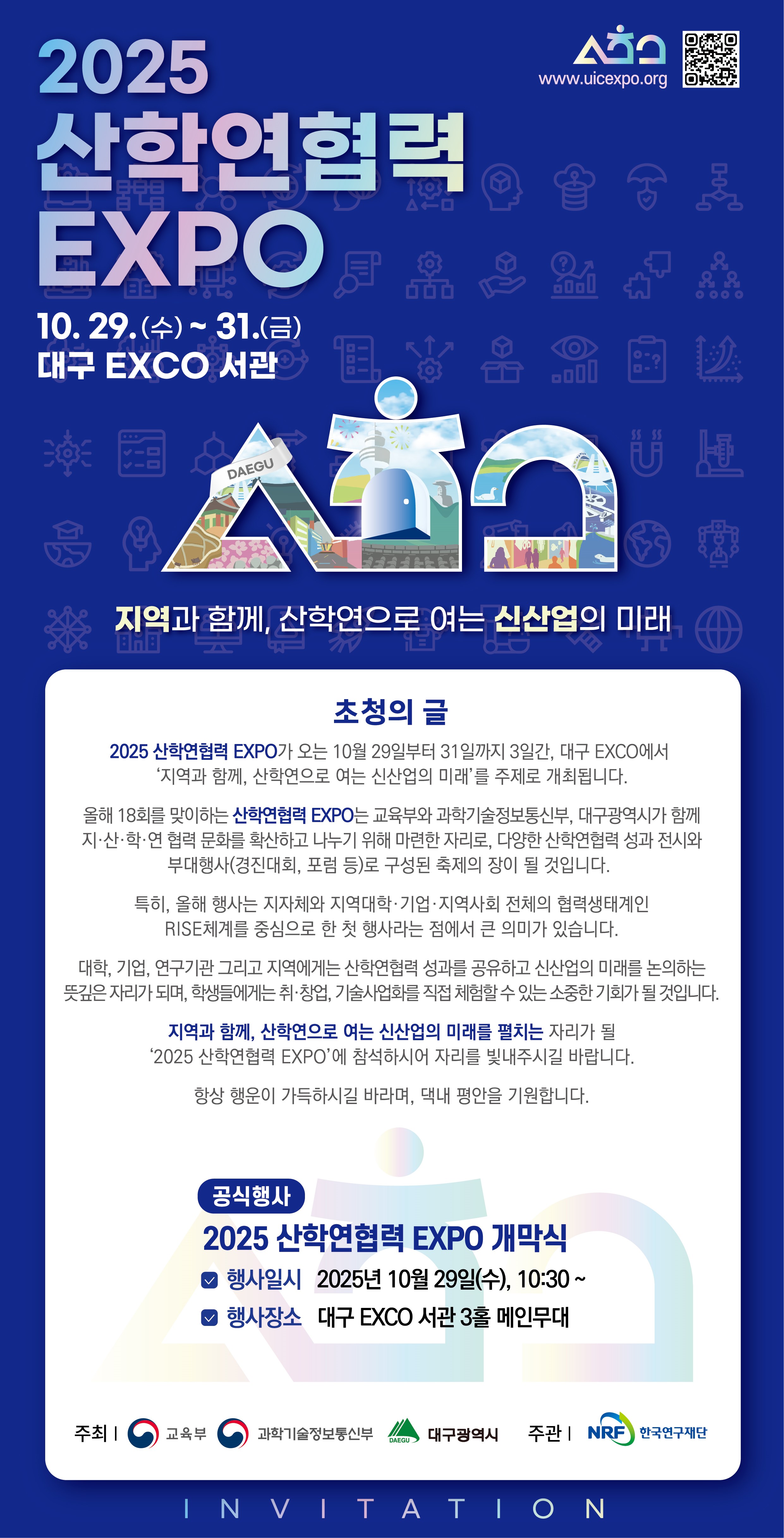 2. 교육부·과학기술정보통신부·대구광역시가 공동 주최하고 한국연구재단이 주관하는 2025 산학연협력 EXPO가 "지역과 함께, 산학연으로 여는 신산업의 미래"를 주제로 아래와 같이 개최됩니다.