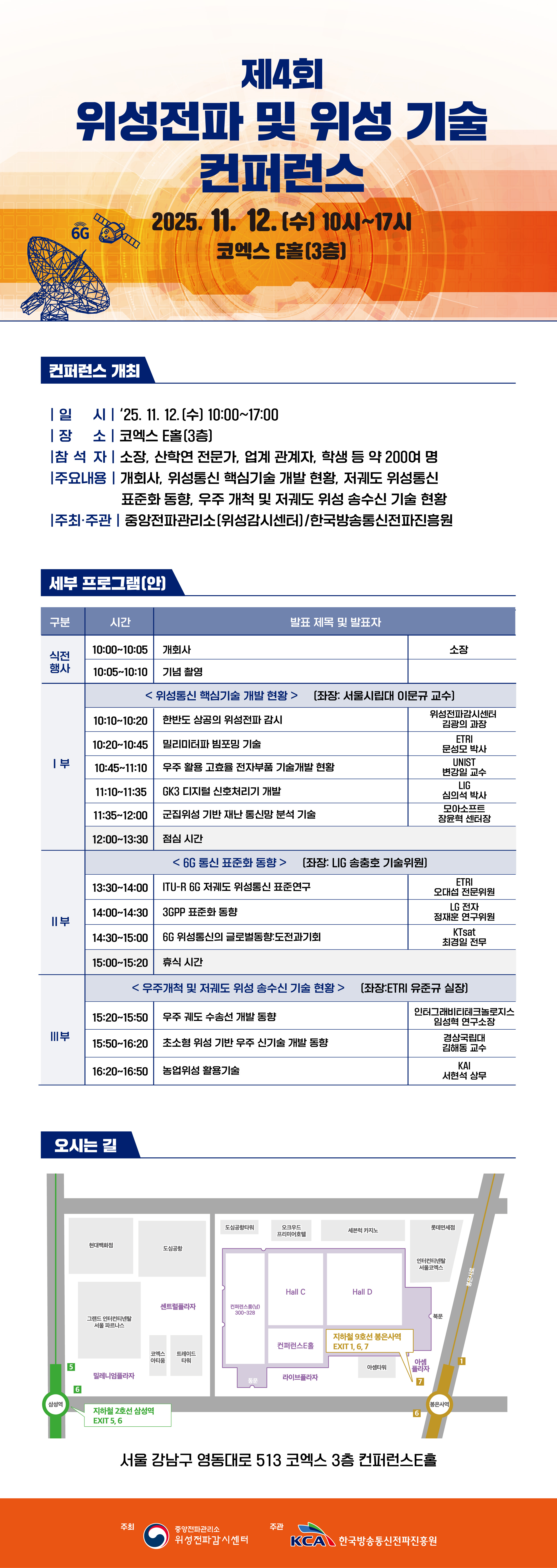 저궤도 위성통신 서비스 도입 등 6G 표준 기술 기반 개발에 따른 위성통신 산업 활성화를 위한 「제4회 위성전파 및 위성 기술 컨퍼런스」를 다음과 같이 개최하오니 홈페이지를 통한 홍보 및 참여 부탁드립니다.