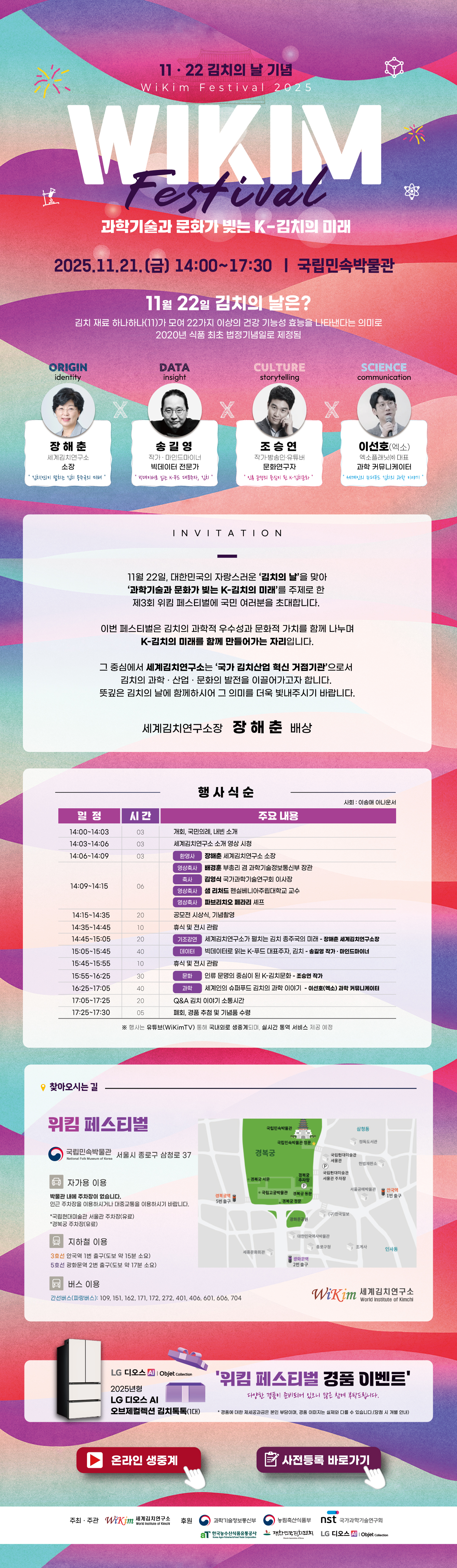 세계김치연구소는 과학기술정보통신부 산하 정부출연연구기관으로 '제6회 김치의 날'을 기념하여 「2025 제3회 위킴 페스티벌」을 개최합니다. 이번 행사는 '과학기술과 문화가 빚는 K-김치의 미래'라는 주제로 다양한 분야 전문가와 함께 K-김치의 미래에 대해 이야기를 나눌 예정입니다.